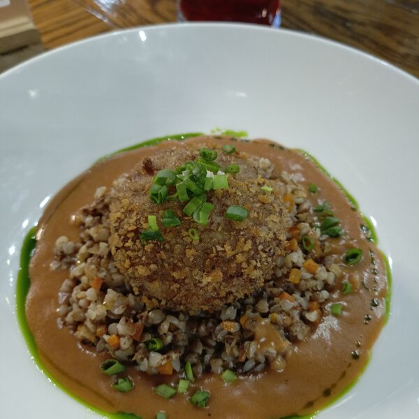 Горячее котлета из утки с гречей и сливочным барбекю - 430₽, красивая подача, очень вкусно, данное блюдо повторил бы однозначно 🔥