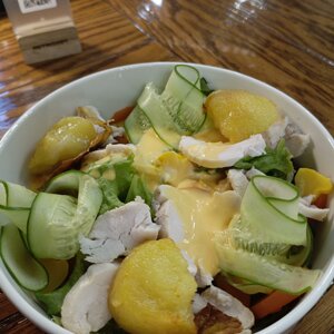 Салат с куриной грудкой и сырным соусом - 370₽, большая порция, вкусно 😋 и картошка запечённая прям огонь 🔥